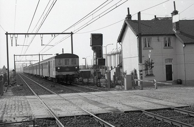 Een reizigerstrein bestaande uit M 2-rijtuigen komt toe in het station Zandvoorde. We zien duidelijk de stuurpost in het eerste M 2-rijtuig, vanwaar diesellocomotief 6322 (achteraan de trein) wordt bediend. Voor de gesloten overweg zien we een lichtsein. Zandvoorde ligt langs de lijn 50A Brussel-Zuid - Gent-Sint-Pieters - Brugge - Oostende. Schenking van Myriam Hendrickx.
