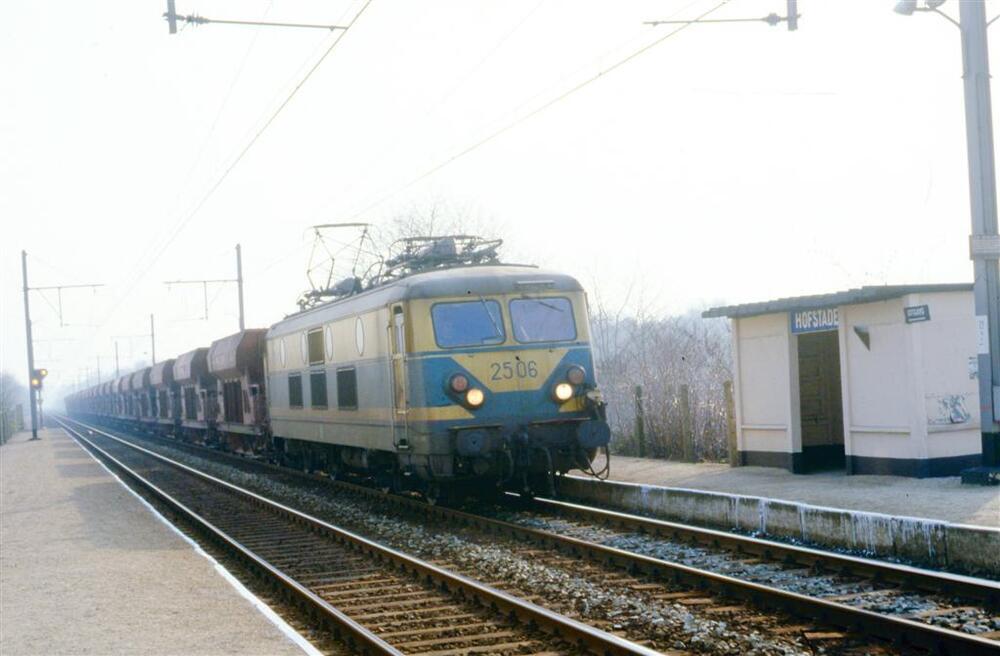 Een elektrische locomotief van de reeks 25 passeert met een goederentrein voorbij de halte Hofstade. We zien de perrons en een schuilhuisje. Op het einde van het linkse perron staat een lichtsein.