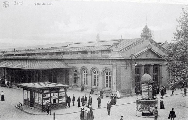Reproductie van een postkaart met als opschrift 'Gand Gare du Sud.' Bovenaan links staat het logo van de uitgever. We zien de voor- en zijgevel van het station. Voor de ingang, die met een luifel is uitgerust, staat een krantenkiosk. Fietsers en voetgangers domineren het straatbeeld. Op het stationsplein bevindt zich een reclamezuil.