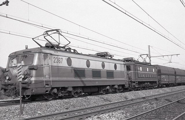 Een kolentrein met dubbele tractie, locomotieven 2367 en 2904, rijdt door Viesville. Locomotief 2367 heeft reeds een gele schildering om de zichtbaarheid te verbeteren. Voor de locomotief zien we een naderingsbaken met vijf strepen. Een baken met strepen wordt gebruikt op lijnen uitgerust met verwittigingsseinen. Boven de sporen hangt een compoundbovenleiding. Deze zorgt bij hoge snelheden voor een goede stroomafname door de locomotief. Schenking van Myriam Hendrickx.