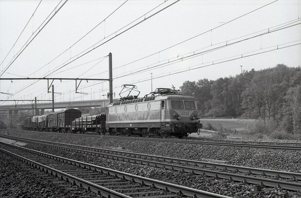 Een goederentrein met locomotief 2222 passeert Viesville. De samenstelling van de trein is gevarieerd, van platte wagens geschikt voor het vervoer van buizen, over gesloten wagens tot open wagens overdekt met een huif. De locomotief heeft een gele schildering om de zichtbaarheid te verbeteren. Op de achtergrond zien we het viaduct van de E420. Deze weg verbindt Nijvel en Charleroi met de Franse grens. Schenking van Myriam Hendrickx.