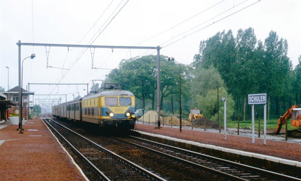 Een elektrische locomotief van de reeks 25 met een reizigerstrein is aangekomen in het station Schulen. De trein is samengesteld uit M 2-rijtuigen. Links zien we een seinhuis en verder hebben we zicht op de perrons, de perronverlichting en een plaatsnaambord. Schenking van Myriam Hendrickx.