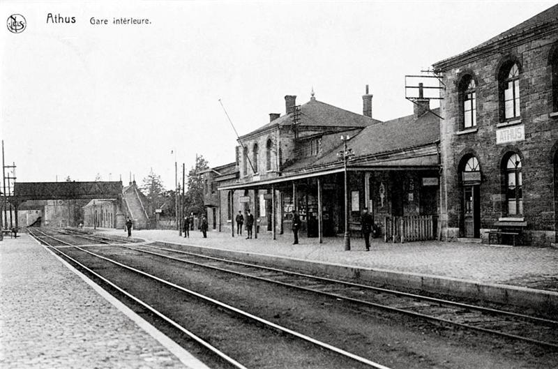 Reproductie van een postkaart met als opschrift 'Athus Gare intérieure.' Bovenaan links staat het logo van de uitgever. De postkaart toont de achtergevel van het stationsgebouw met luifel. Op het perron wachten reizigers en spoorwegpersoneel op de komst van de trein. Op de achtergrond overspannen een passerelle en een brug de sporen. Achter de voetgangersbrug is nog net een mechanisch sein met twee armen zichtbaar. De dwarsliggers zijn met ballast bedekt.