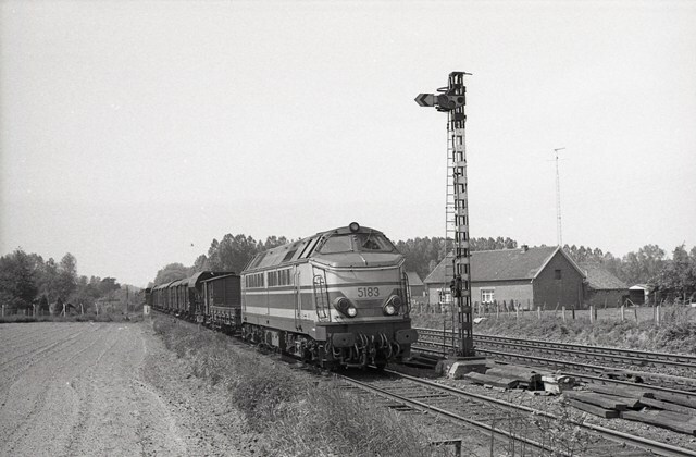 Een goederentrein met diesellocomotief 5183 rijdt voorbij een mechanische seinpaal te Schulen. De trein is samengesteld uit een platte wagen, een tremelwagen en een aantal gesloten wagens. Naast de sporen liggen houten dwarsliggers. Schenking van Myriam Hendrickx.