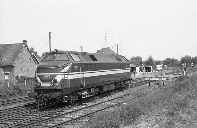 Diesellocomotief 5190 staat als losse locomotief in Schulen voor een overweg zonder slagbomen. Rechts zien we een doodlopend spoor met stootblok.