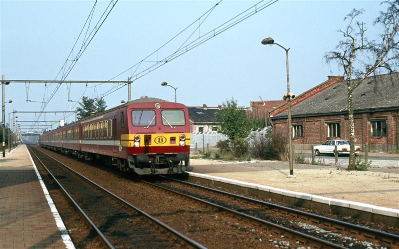 We zien een reizigerstrein samengesteld uit M 4-rijtuigen. Vooraan bevindt zich een rijtuig met ingebouwde stuurpost. De trein wordt geduwd door elektrische locomotief 2123.