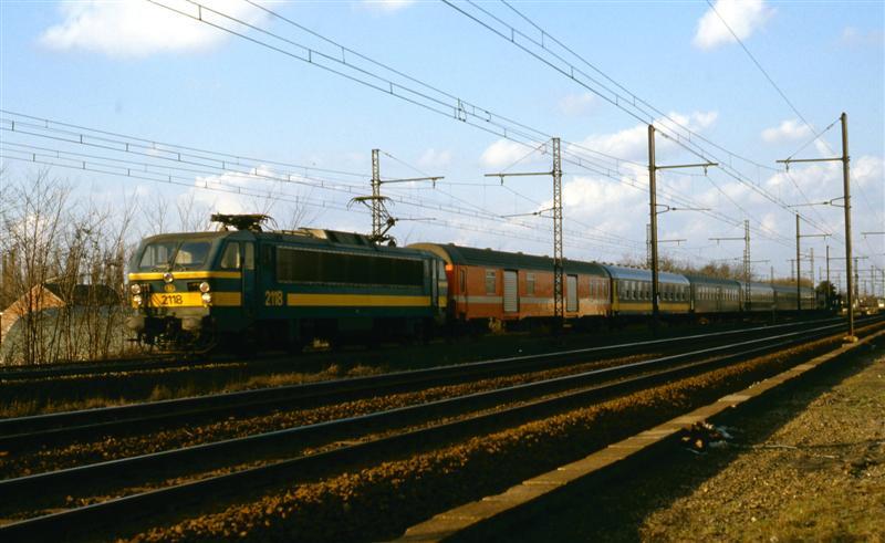 BeschrijvingWe zien een elektrische locomotief van de reeks 21 met een internationale trein samengesteld uit Belgische, Nederlandse en Duitse rijtuigen.