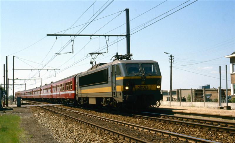 Deze fotogroep bevat 2 dia's. We zien een elektrische locomotief van de reeks 21 met een reizigerstrein samengesteld uit M 4-rijtuigen. De trein rijdt ter hoogte van de voormalige halte Marke die op dat moment reeds twee jaar gesloten was. Het perron ligt er nog en we zien rechts ook nog twee palen waarop het stationsnaambord bevestigd was. De tweede foto is genomen vanuit de andere richting en toont de elektrische locomotief 2126 die een sleep M 4-rijtuigen duwt. Schenking van Myriam Hendrickx.