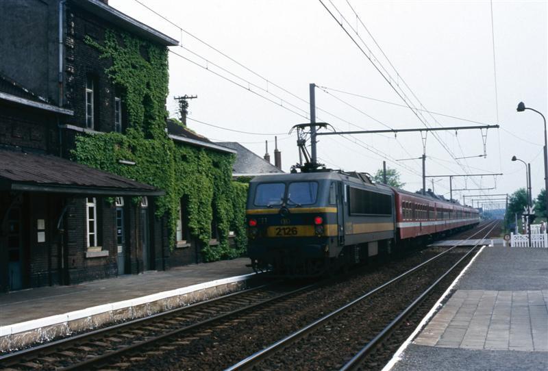 Deze fotogroep bevat 2 dia's. Op de eerste foto heeft een elektrische locomotief van de reeks 21 net het station van Herzele verlaten. Zij duwt een reizigerstrein met M 4-rijtuigen. Het stationsgebouw en de perrons zijn duidelijk in beeld gebracht. De tweede foto laat de aankomst zien van elektrische locomotief 2108 in hetzelfde station. Ook zij sleept een reizigerstrein bestaande uit M 4-rijtuigen. Schenking van Myriam Hendrickx.