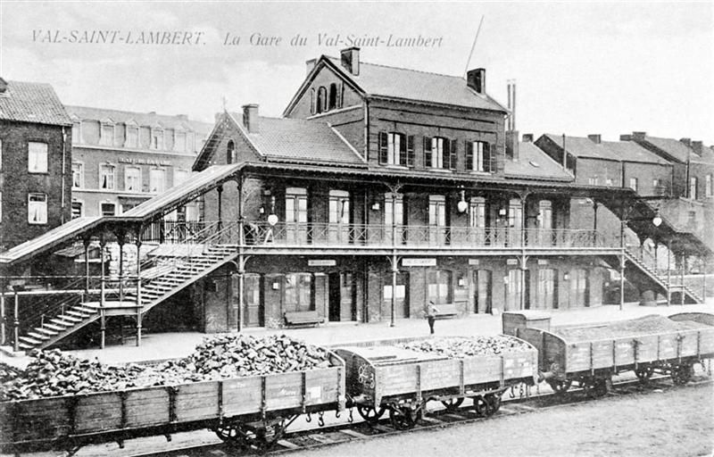 Reproductie van een postkaart met als opschrift 'Val-Saint-Lambert. La Gare du Val-Saint-Lambert'. De postkaart stelt de zij- en achtergevel voor van het station dat uitgerust is met een galerij die tevens dienst doet als luifel. Twee overdekte trappen geven toegang tot het perron. Op de voorgrond staan open goederenwagens met hun lading opgesteld. Op de achtergrond zien we woningen langsheen een straat die zich een niveau hoger dan de sporen bevindt.