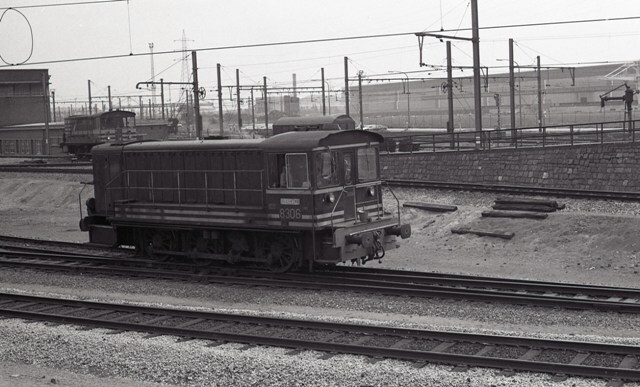 Rangeerlocomotief 8306 aan het werk in het sporencomplex te Châtelineau. De locomotief is groen geschilderd met gele zichtbaarheidsstrepen en heeft enkele koplampen. Achter de locomotief zien we een rangeerlocomotief van hetzelfde type met typische ‘Z’-schildering en dubbele koplampen. Schenking van Myriam Hendrickx.