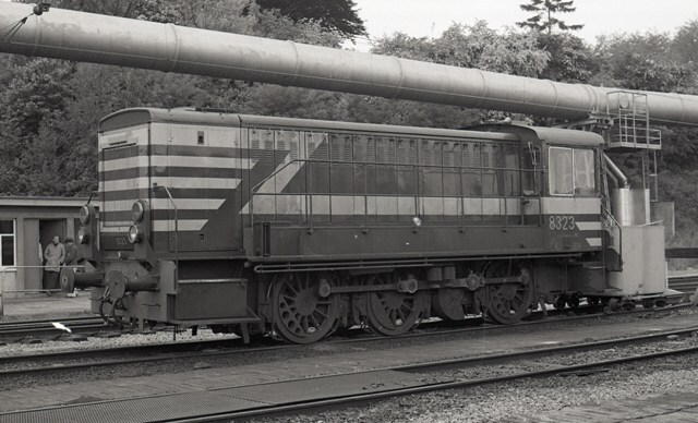 We zien rangeerlocomotief 8323 te Châtelineau. Op de achtergrond zien we spoorwegpersoneel. Op de achtergrond zien we een metalen pijp die dient om stoffen te transporteren tussen verschillende vestigingen van de metaalverwerkende nijverheid in de omgeving. Schenking van Myriam Hendrickx.
