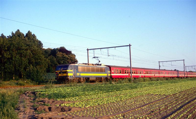 BeschrijvingWe zien een elektrische locomotief reeks 21 met een reizigerstrein samengesteld uit M 4-rijtuigen.