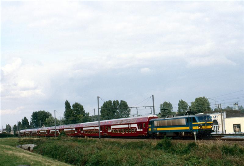 BeschrijvingEen elektrische locomotief van de reeks 21 rijdt met een reizigerstrein ter hoogte van Lot. De trein is samengesteld uit M 5-rijtuigen.