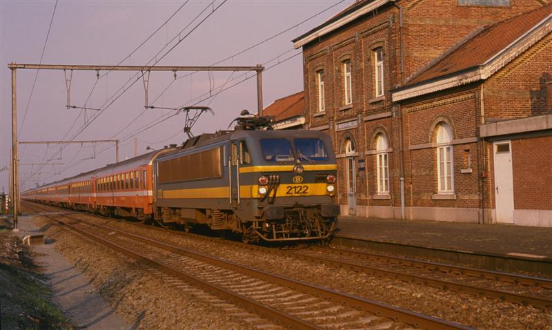 Een elektrische locomotief van de reeks 21 rijdt met een reizigerstrein voorbij het station Beervelde. De trein is samengesteld uit I 10-rijtuigen. We zien op de achtergrond het stationsgebouw dat op het moment buiten dienst was. Vanaf 2008 stopten er opnieuw treinen in Beervelde. Het stationsgebouw staat er tegenwoordig nog steeds maar heeft geen functie meer. Schenking van Myriam Hendrickx.