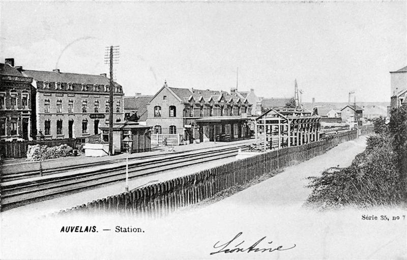 Reproductie van een postkaart met als opschrift 'Auvelais. - Station. Série 35, n° 7'. Onderaan staat een met de hand geschreven naam. De postkaart toont de zij- en achtergevel van het tweede stationsgebouw van Auvelais. Het is voorzien van een luifel en dakvensters. Links van het station bevinden zich de toiletten. Langsheen de spoorlijn staan telefoon- en telegraafpalen opgesteld. De perrons worden met petroleumlantaarns verlicht. Aan de overzijde van het station biedt een schuilhuisje de reizigers beschutting tegen regen en wind. De sporen zijn met ballast bedekt. Een schutting, bestaande uit afgedankte dwarsliggers, bakent het spoorwegdomein af. Rechts op de achtergrond zien we nog net een baanwachtershuisje.