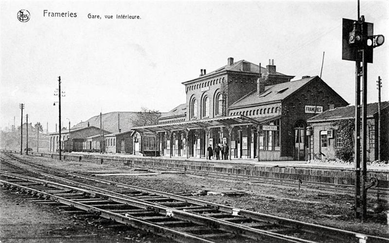 Reproductie van een postkaart met als opschrift 'Frameries Gare, vue intérieure.' Bovenaan links staat het logo van de uitgever. De postkaart toont de zij- en achtergevel van het station dat van een luifel voorzien is. Op het perron poseert het stationspersoneel. De goederenloods bevindt zich links van het stationsgebouw. Vooraan rechts staat een mechanisch sein van het type Nord-Belge opgesteld. Op de achtergrond zien we de contouren van een mijnheuvel.