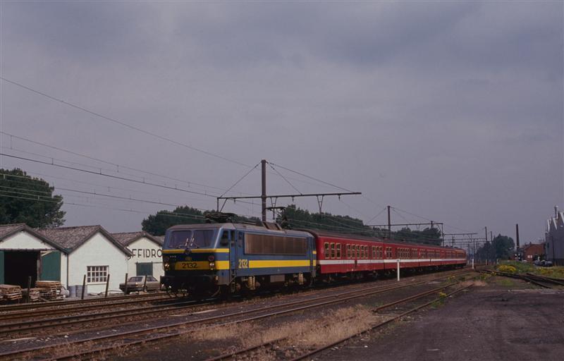 BeschrijvingWe zien een elektrische locomotief van de reeks 21 met een reizigerstrein samengesteld uit M 4-rijtuigen.