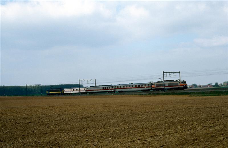 BeschrijvingWe zien een elektrische locomotief van de reeks 21 met een testtrein van de Franse spoorwegen bestaande uit drie rijtuigen en een locomotief van de SNCF.