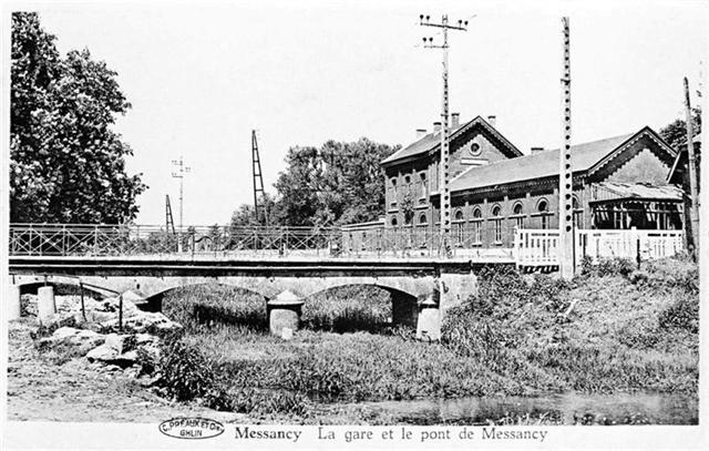 Reproductie van een postkaart met als opschrift 'Messancy La gare et le pont de Messancy'. Onderaan links staat het logo van de uitgever. De postkaart toont de brug en de voor- en zijgevel van het stationsgebouw. Langs de spoorbaan staan telefoon- en telegraafpalen opgesteld. Rechts zien we in het verlengde van de brugreling een betonnen afsluiting die typisch is voor de Belgische spoorwegen.