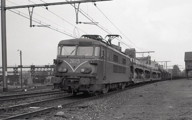 Elektrische locomotief 2615 rijdt met een gemengde goederentrein voorbij Farciennes. De twee eerste goederenwagens zijn geladen met auto's, verder zien we tremelwagens. Op de achtergrond zien we de kolenwasserij en kolenzeverij "des Charbonnages Réunis de Roton Farciennes" te Tergnée. Links van de trein zien we een metalen constructie waarop een aantal kleine kolenwagens zichtbaar zijn, die voortbewegen in een gesloten lus door middel van kettingen. Schenking van Myriam Hendrickx.