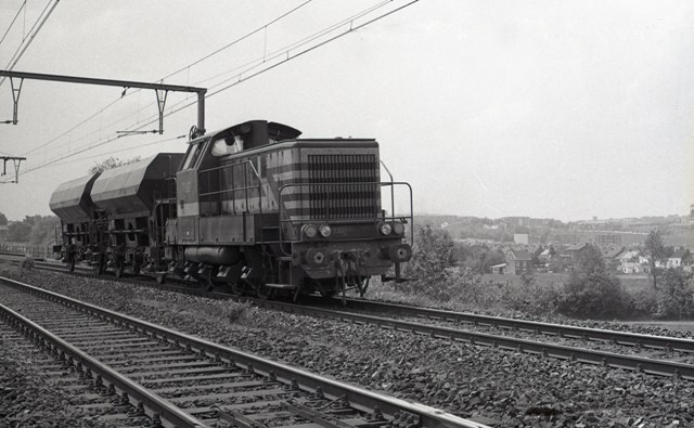 BeschrijvingRangeerlocomotief 7307 rijdt met twee tremelwagens door Farciennes.