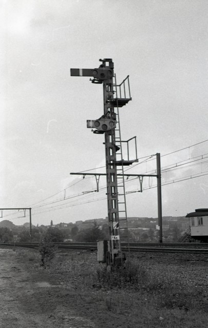We zien een mechanische seinpaal in gesloten stand. Het sein heeft twee armen: een rood stopsein bovenaan en daaronder een paars rangeersein. In de armen zijn telkens drie gekleurde lenzen verwerkt zodat 's nachts lichtseinen konden gegeven worden. Beide armen konden in drie standen gezet worden. Schenking van Myriam Hendrickx.