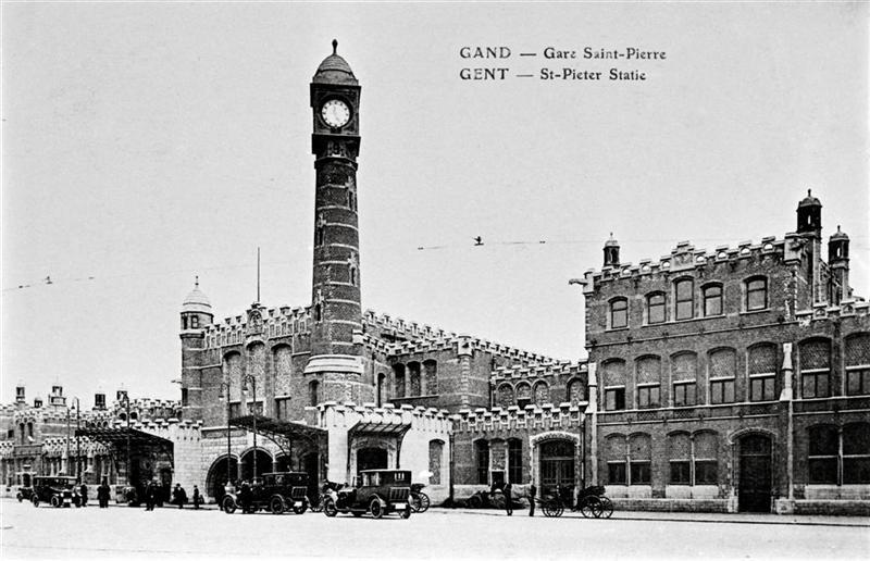 Reproductie van een postkaart met als opschrift 'Gand - Gare Saint-Pierre Gent - St-Pieter Statie'. De postkaart toont de voorgevel van het station met zijn luifels, kantelen en torentjes. De centrale inkomhal wordt geflankeerd door een uurwerktoren. Voor het gebouw staan paardenkoetsen en auto's opgesteld. Voor de ingang passeren enkele voorbijgangers.