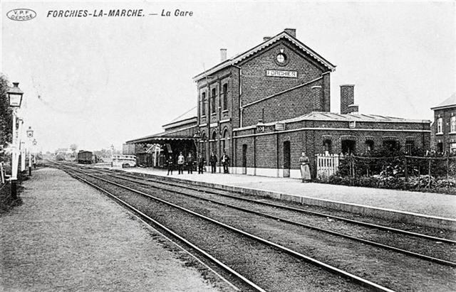 Reproductie van een postkaart met als opschrift 'Forchies-La-Marche. - La Gare'. Bovenaan links staat het logo van de uitgever. De postkaart toont de zij- en achtergevel van het stationsgebouw met luifel. Op het perron poseren een dame en het stationspersoneel voor de fotograaf. Links staan petroleumlantaarns opgesteld voor de verlichting van het perron. De dwarsliggers zijn met ballast bedekt. Op de achtergrond zijn op een zijspoor enkele gesloten goederenwagens zichtbaar.