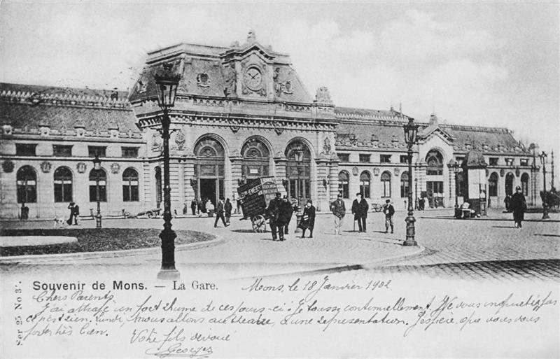 Reproductie van een postkaart met als opschrift 'Ser 25 N° 3. Souvenir de Mons. - La Gare.' Onderaan staat een handgeschreven boodschap. De postkaart toont het tweede stationsgebouw uit 1870. In de voorgevel vallen de ramen en deuren met rondboog op. Het centrale gedeelte wordt bekroond door een ornament met stationsklok. Op het stationsplein verplaatsen voetgangers zich in alle richtingen. Sommigen onder hen kijken in de richting van de fotograaf. Naast de rotonde staat een stootkar opgesteld. Rechts zien we een reclamezuil. Voor de verlichting van de stationsomgeving worden gaslantaarns gebruikt.