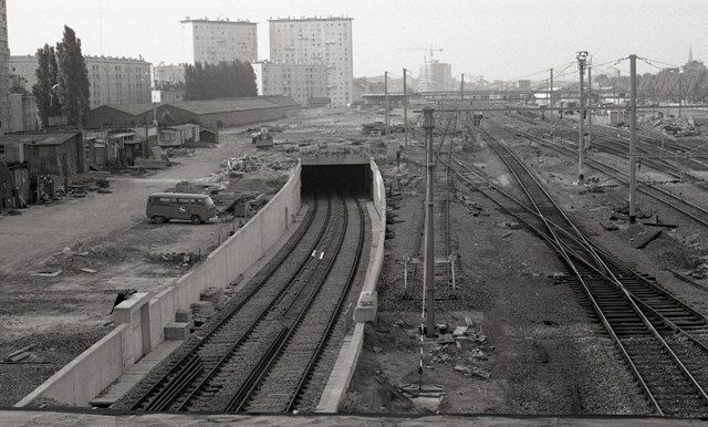 BeschrijvingNaast spoorlijn 28 en de voormalige sporenbundel van Brussel-West zien we de werken die bezig zijn voor de metro van Brussel.