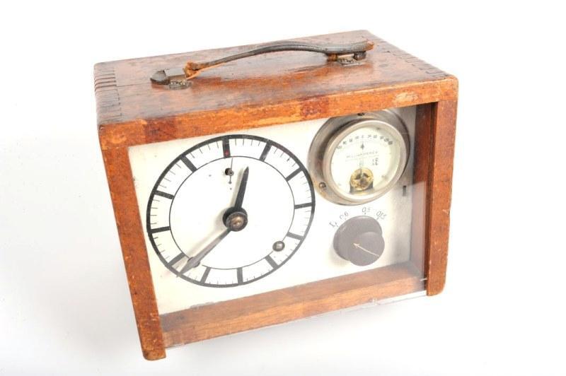 Een ampèremeter is een instrument om elektrische stroom te meten. Deze draagbare meter werd gebruikt door de dienst Elektriciteit en Seininrichting. Aan één zijde van de houten kist, achter een doorzichtige kunststofplaat, bevinden zicht twee wijzerplaten en een draaiknop. De ene wijzerplaat is een klok. De tweede wijzerplaat duidt het aantal milliampères aan (tot 150). De draaiknop heeft vier standen L, 06, 03 en 0,15. Aan de rechterzijkant zijn zeven aansluitingspunten: 1, 2, 3, 4, -A, + en -. Het kistje heeft bovenaan een leren handvat.