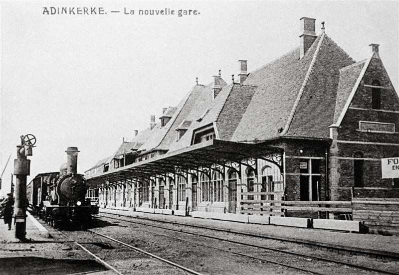 Reproductie van een postkaart met als opschrift 'Adinkerke. - La nouvelle gare.' De postkaart toont de zij- en achtergevel van het station met luifel. Wegens de werken is het gebouw met een hek afgesloten. Op perron 2 zien we een waterkolom voor de bevoorrading van de stoomlocomotieven. Een locomotief type 1 (1B) staat klaar om met een reizigerstrein te vertrekken. De dwarsliggers zijn met ballast bedekt.