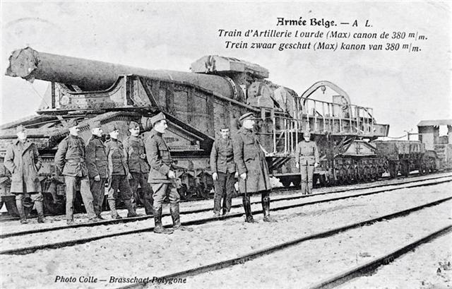 Reproductie van een postkaart met als opschrift 'Armée Belge. - A L. Train d'Artillerie lourde (Max) canon de 380 m/m. Trein zwaar geschut (Max) kanon van 380 m/m.' en als uitgever 'Photo Colle - Brasschaet Polygone'. de postkaart toont een trein die met zwaar geschut is uitgerust. Voor de trein poseren soldaten van het Belgische leger. De dwarsliggers zijn met ballast bedekt. Gelet op de locatie en de uniformen dateert de foto van na de Eerste Wereldoorlog.