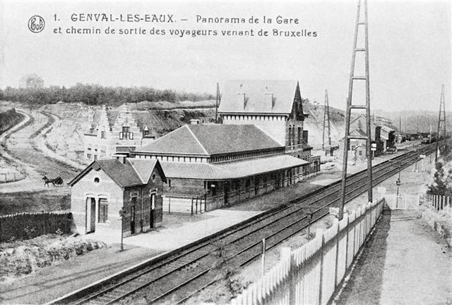 Reproductie van een postkaart met als opschrift '1. Genval-les-Eaux. - Panorama de la Gare et chemin de sortie des voyageurs venant de Bruxelles'. Bovenaan links staat het logo van de uitgever. De postkaart toont de zij- en achtergevel met luifel van het station. Links van het gebouw bevinden zich de toiletten. Rechts zien we de goederenloods en enkele telefoon- en telegraafpalen. Een houten afsluiting bakent het spoorwegdomein af.