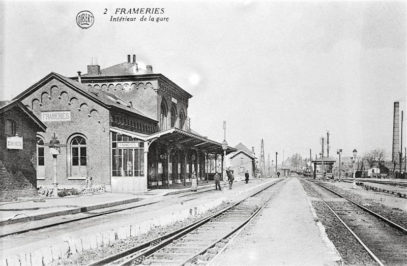 Reproductie van een postkaart met als opschrift '2 Frameries Intérieur de la gare'. Bovenaan links staat het logo van de uitgever. De postkaart toont de zij- en achtergevel van het station met luifel. Op het perron poseren enkele personen voor de fotograaf. Voor de verlichting van de perrons worden petroleumlantaarns gebruikt. Op de achtergrond zien we het baanwachtershuisje, enkele telefoon- en telegraafpalen, een mechanisch sein van de Maatschappij Nord-Belge en een fabrieksschoorsteen.