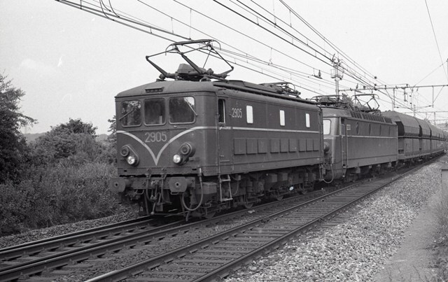 Elektrische locomotief 2905 rijdt als voorspanlocomotief voor locomotief 2233. Deze dubbeltractie sleept een ertstrein door Sint-Genesius-Rode. De locomotieven rijden over een wissel om op een ander spoor hun weg voort te zetten. Schenking van Myriam Hendrickx.