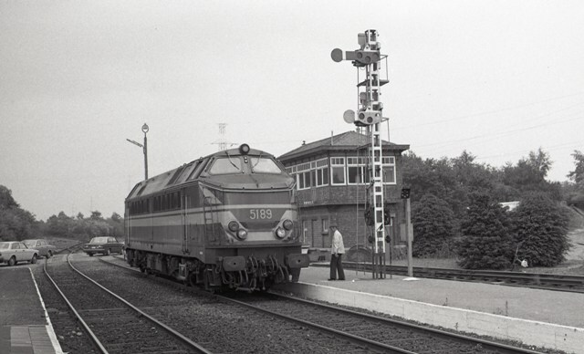 We zien diesellocomotief 5189 als losse locomotief te As. De overweg achter de locomotief is terug open voor het doorgaande wegverkeer. Naast de locomotief zien we de seinpost en een mechanische seinpaal. De seinpaal heeft twee seinarmen die elk twee standen kunnen aannemen. Deze seinen worden nog mechanisch bediend. Rechts naast de sporen zien we een handbediening om de wissel in een andere stand om te leggen (handel met witte bol). Schenking van Myriam Hendrickx.