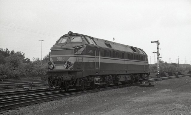 We zien diesellocomotief 5184 als losse locomotief in het sporencomplex te As. Achter de locomotief is een mechanische seinpaal te zien. De seinpaal heeft twee seinarmen die elk twee standen kunnen aannemen. Deze seinen worden nog mechanisch bediend. Rechts naast de sporen zien we een handbediening om de wissel in een andere stand om te leggen (handel met witte bol). Verderop liggen stapels houten dwarsliggers. Schenking van Myriam Hendrickx.