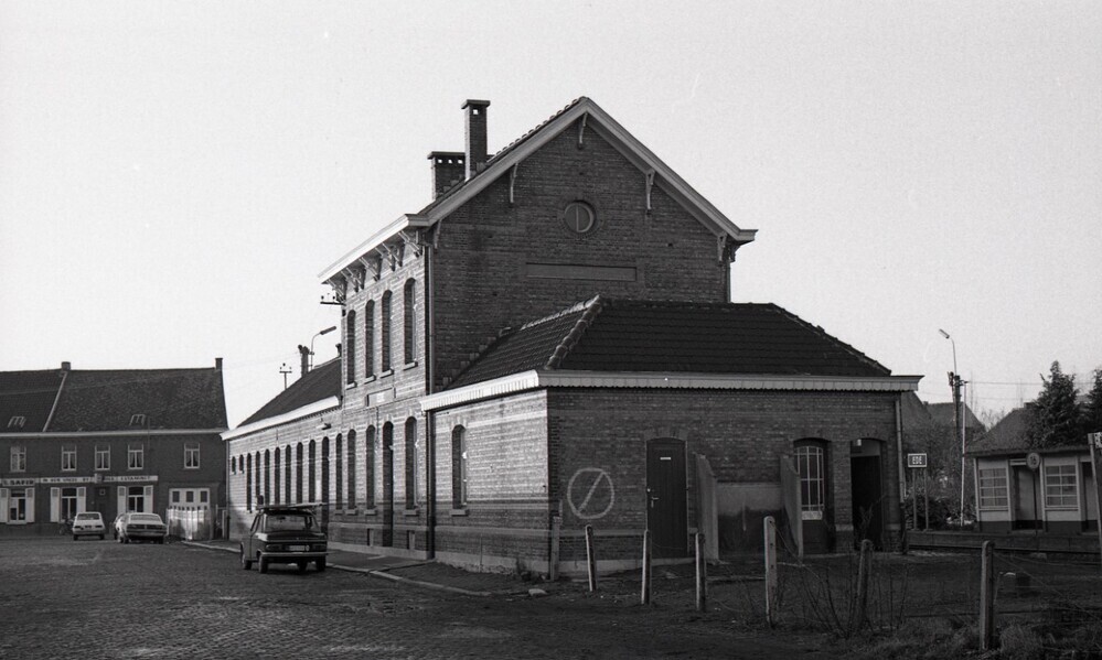 We zien de voor- en zijgevel van het stationsgebouw. Voor het station staan enkele auto's geparkeerd. Uiterst rechts op de foto zien we een schuilhuisje en een stationnaamsbord op het tweede perron.