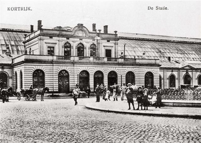 Reproductie van een postkaart met als opschrift 'Kortrijk. De Statie.' De postkaart toont de voorgevel van het eerste stationsgebouw met zijn ronde bogen voor deuren en vensters. Een ornament met stationsklok bekroont het centrale gedeelte. Achter het gebouw is de perronoverkapping zichtbaar. Voorbijgangers kijken in de richting van de fotograaf. Voor het station wachten koetsiers op hun klanten.