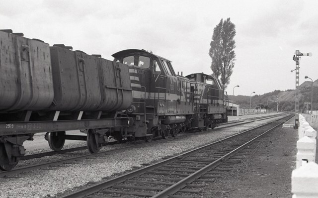 BeschrijvingDeze fotogroep bevat drie negatieven. Op alle foto's zien we rangeerlocomotieven 7393 en 7334 met een sleep kübelwagens van de koolmijn in de omgeving van Eisden-mijn. Kübelwagens werden gebruikt in het Kempisch bekken voor het transport van kolen. Rechts op de foto's zien we een mechanisch sein (tweestanden stelsel). De seinarm kon twee standen aannemen: 0° beveelt de trein te stoppen of 45° om de doorrit van de trein toe te staan.