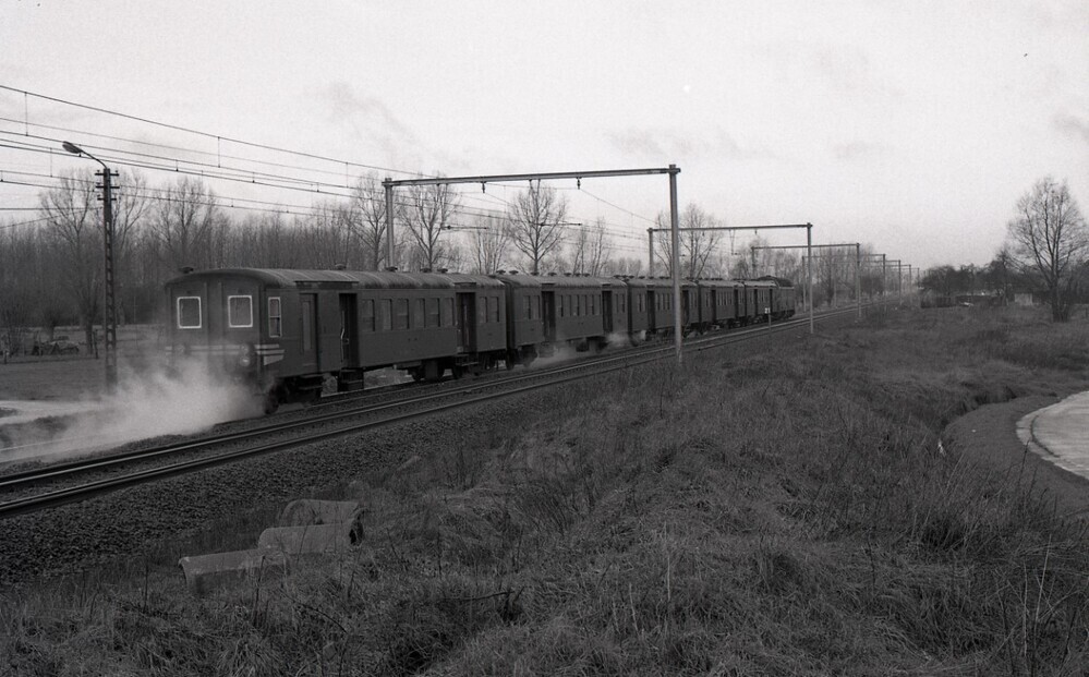 We zien de achterzijde van een reizigerstrein bestaande uit M 1-rijtuigen. De trein wordt gesleept door diesellocomotief 6289 (reeks 62). Het laatste rijtuig is uitgerust met een stuurpost. De witte dampen onder de rijtuigen zijn stoomdampen. Bij dieseltractie werden de rijtuigen namelijk verwarmd met stoom afkomstig van de diesellocomotief. De verbinding tussen de locomotief en de rijtuigen gebeurde door slangen die aaneen gekoppeld werden. De stoom die we hier zien ontsnapte ten gevolge van een lek tussen de rijtuigen. Schenking van Myriam Hendrickx.