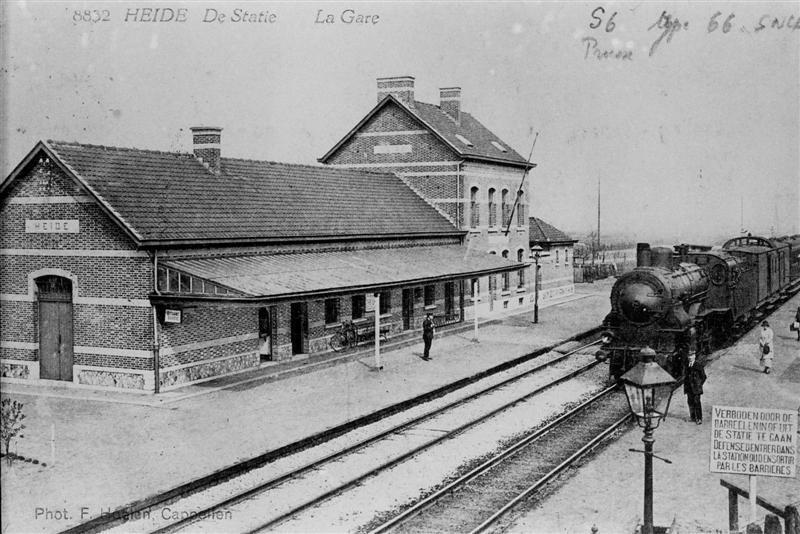 Reproductie van een postkaart met als opschrift '8832 Heide De Statie La Gare' en als uitgever 'Phot. F. Hoelen Cappellen'. Bovenaan rechts staat een met de hand geschreven boodschap. De postkaart toont de zij- en achtergevel van het stationsgebouw met luifel. Een reizigerstrein, gesleept door een stoomlocomotief type 66 (2B American), is net aangekomen. Op het perron naast spoor twee kijken de stationschef en reizigers in de richting van de fotograaf. Vooraan rechts zien we een petroleumlantaarn en een tweetalig verbodsbord.