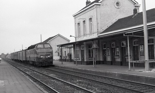 Diesellocomotief 6252 komt met een reizigerstrein aan in station Merchtem. De locomotief sleept drie M 2-rijtuigen. Het perron heeft een luifel. Op het perron en achter de trein zien we reeds de palen die de overgang naar elektrische tractie aankondigen. Station Merchtem ligt langs de lijn 60 (Brussel-Noord - Dendermonde). Schenking van Myriam Hendrickx.