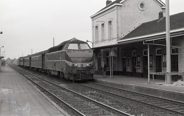 Diesellocomotief 6299 komt met een reizigerstrein aan in het station Merchtem. De locomotief sleept vier K-rijtuigen. Het perron heeft een luifel. Op het perron en achter de trein zien we reeds de palen die de overgang naar elektrische tractie aankondigen. Station Merchtem ligt langs de lijn 60 (Brussel-Noord - Dendermonde). Schenking van Myriam Hendrickx.