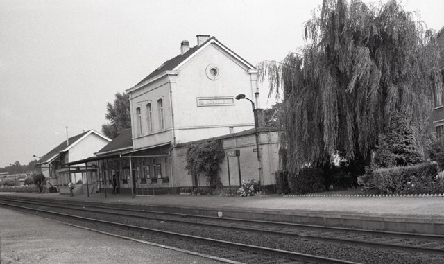 We zien de achterzijde van het stationsgebouw. Op het perron zijn een luifel en een schuilhuisje te zien. Het lage gebouw is versierd met een klimplant en een planten- en bloemenborder. Naast het lage gebouw zien we een plantsoen met een treurwilg. Station Merchtem ligt langs de lijn 60 (Brussel-Noord - Dendermonde). Schenking van Myriam Hendrickx.