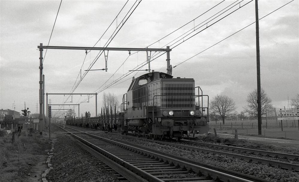 Deze locomotief behoort tot de reeks 74. Zij heeft een werktrein bestaande uit platte wagens met rongen aan de haak. Op deze wagens staan spoorwegbedienden die de werken begeleiden. Het witte rechthoekig bord met vijf zwarte schuine strepen, links op de foto, is een mistbaken. Ter hoogte van dit bord is men nog 250 m verwijderd van een sein. Schenking van Myriam Hendrickx.