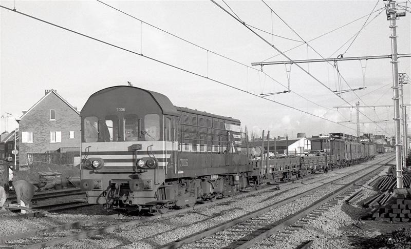 Deze locomotief behoort tot de reeks 70. Zij versleept een werktrein die speciaal is uitgerust om de bovenleiding te monteren. Links op de foto is een bediende metingen op het spoor aan het uitvoeren.