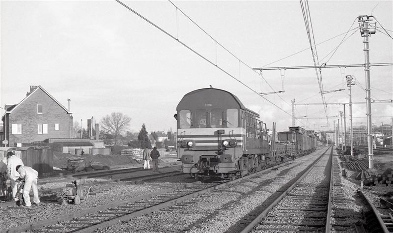 Deze locomotief behoort tot de reeks 70. Zij versleept een werktrein die speciaal is uitgerust om de bovenleiding te monteren. Links op deze foto zien we spoorarbeiders die hun taak aan het uitvoeren zijn.